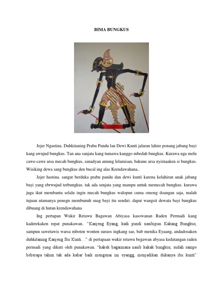 28+ Bima Bungkus Singkat Bahasa Jawa Ngoko. Bima putrane dewi kunti lan prabu pandu lair awujud bungkus kang ora bisa di suwek.bima de tinggal ana ing ngalas mandalasara.wolung taun bima glundhang glundhung ana ing ngalas,wit witan pada mati,telaga pd kering,kewan kewan pada mlayu2,jin jin pada keganggu lan ratune para jin batari. Disusun oleh kelompok 4 kelas x mia 2: